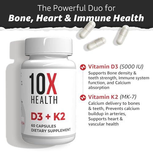 10X Health Vitamin D3 5000 IU & K2 MK7 – Menaquinone 7, High-Potency D3 K2 Vitamin Supplement for Bone Health, Heart and Teeth – 125 mcg Vitamin D & 90 mcg Vitamin K2-60 Capsules
