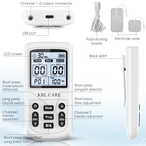 WHAT YOU GET – 1 x Dual Channel Electrodes Muscle Stimulator, 3 x Square 2″ TENS Machine Pads, 2 x Large Rectangular 2″ x 4″ Pads, 2 x Lead Wires, 1 x Pads Holders, 1 x Type-C Cable, 1 x User Manual, 24-month warranty improve, and friendly customer service.