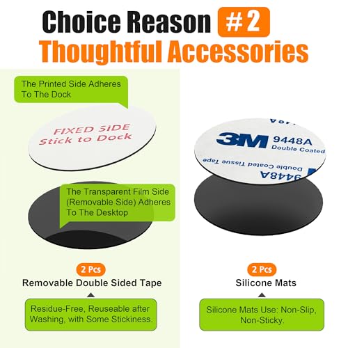 ⭕[Thoughtful Accessories] Included: 2 non-slip silicone pads, 2 removable double-sided adhesive pads. One side of the removable pads is the fixed side, which is attached to the dock bottom, and the other side is the removable side, which is attached to the desktop. The removable side has a certain adhesiveness and may also be repeatedly attached and removed. If the removable side becomes dusty and its adhesiveness is reduced, it may be recovered by washing.