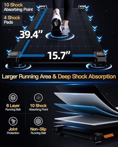 Dual Shock Absorption System & Anti-Slip Running Belt: Under desk treadmill for home features a wider running belt with a 15.7″ × 39.5″ spacious running area. It includes a 6-layer anti-slip belt, 10 silicone shock absorbers, and 4 shock-absorbent cushions. These features help absorb shock and reduce noise, making your running quieter and more stable. They also reduce the impact on your body, ensuring protection for your knees, muscles, and joints during running.