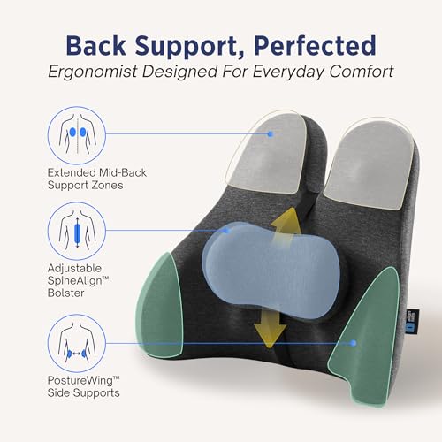 ✔ DESIGNED BY ERGONOMISTS FOR BACK SUPPORT: Adjustable SpineAlign bolster slides to support the lower–mid back and reduce pressure buildup, while PostureWing side panels help steady posture through long sitting sessions. Ideal for use as a lumbar support pillow for office chair or car lumbar support for driving seat.