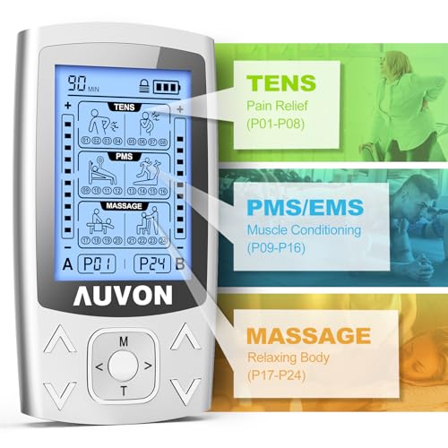 AUVON Dual Channel TENS EMS Unit 24 Modes Muscle Stimulator for Pain Relief, Rechargeable TENS Machine Massager with 12 Pads, ABS Pads Holder, USB Cable and Dust-Proof Storage Bag