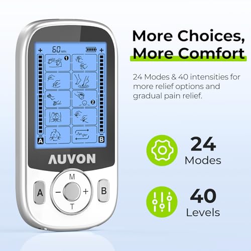 AUVON TENS Unit Muscle Stimulator with Independent Dual Channels for Back Pain Therapy, Rechargeable TENS Machine with 24 Modes & 40 Intensities for Gradual Neck, Sciatica Relief, with 12 TENS Pads