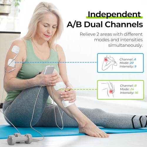 Dual-Channel Muscle Stimulator with 24 Modes & 40 Intensities for Personalized Pain Relief: This muscle stimulator for pain relief therapy features independent dual channels to treat two areas at once with different settings, saving time and improving efficiency. Choose between 24 modes to relieve different pain in a secure way, and adjust 40 intensities for smooth, customizable relief. Ideal for office workers, athletes, seniors and people need daily pain management