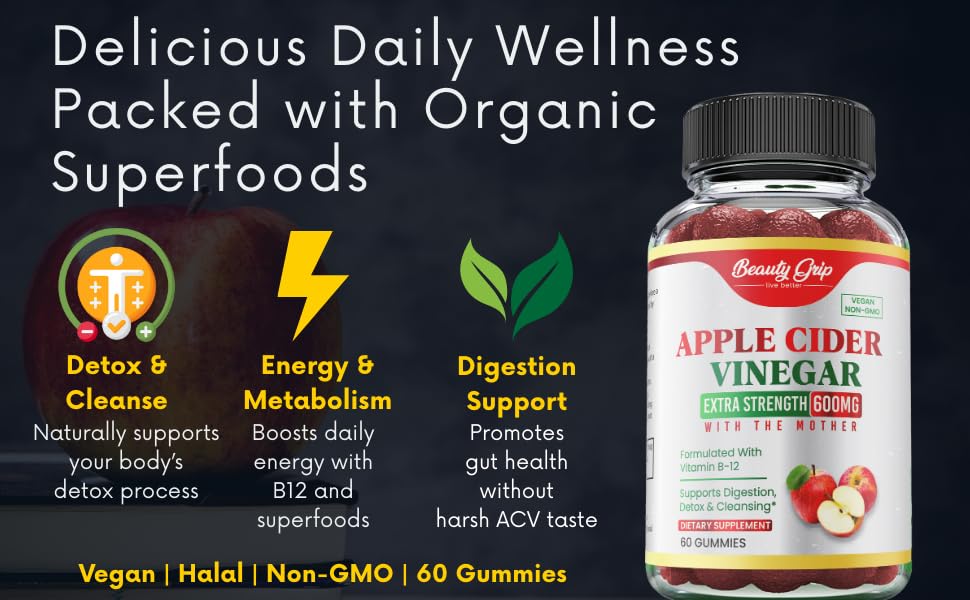 Beauty Grip Apple Cider Vinegar Gummies with The Mother – Organic ACV + Pomegranate, Beetroot & B12 – Digestive, Detox & Energy Support – Vegan, Halal – 60 Gummies