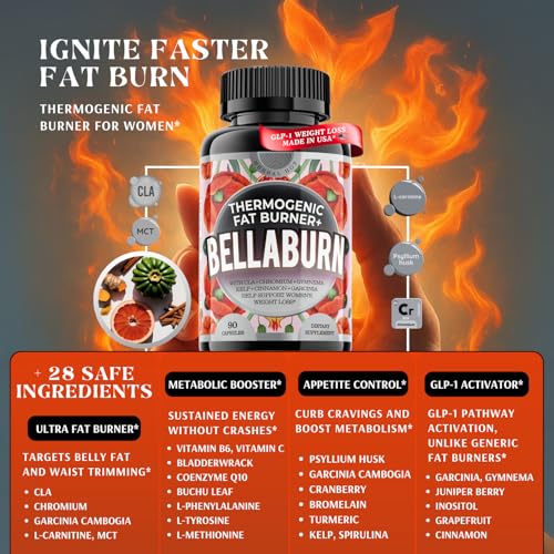 Bellaburn – Belly Fat Burner for Women, Appetite Suppressant for Weight Loss, Metabolism Booster, Thermogenic Fat Burners, Diet Pills that Work Fast, Weight Loss Pills, USA Made, 3rd Party-Tested
