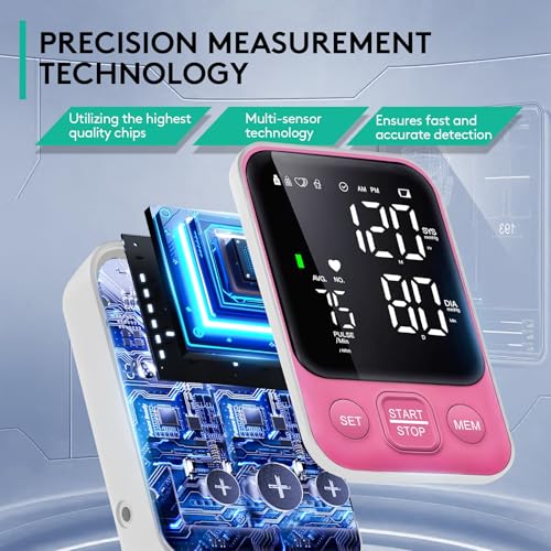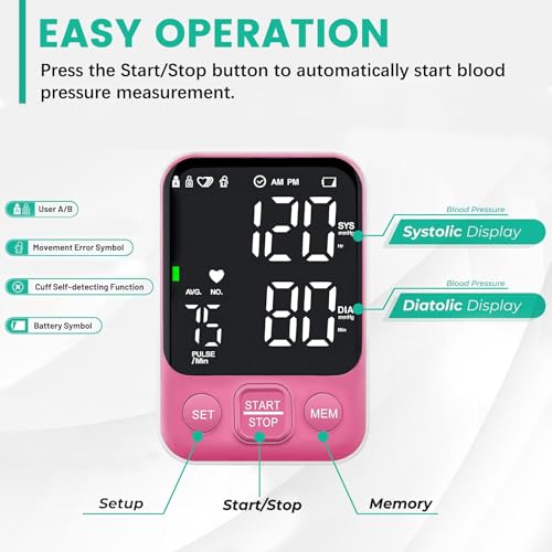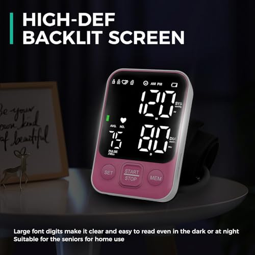 Blood Pressure Monitor Upper Arm Monitors for Home Use BP Machine with 2×120 Reading Memory Adjustable Arm Cuff 8.7″-15.7″ Large Display with LED Background Light Storage Bag Pink