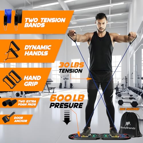 BodyBrandz Push Up Board – Pushup Board Exercise Equipment with Resistance Bands, Pushup Handles – Fitness Equipment for Strength Training, Full-Body Workout – Foldable Push Up Board for Home, Gym