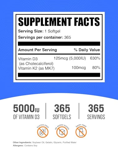 BulkSupplements.com Vitamin D3 + K2 5000 IU Softgels – D3 K2 Supplement, for Immune Health – Gluten Free, 1 Softgel per Serving, 365 Count (Pack of 1)