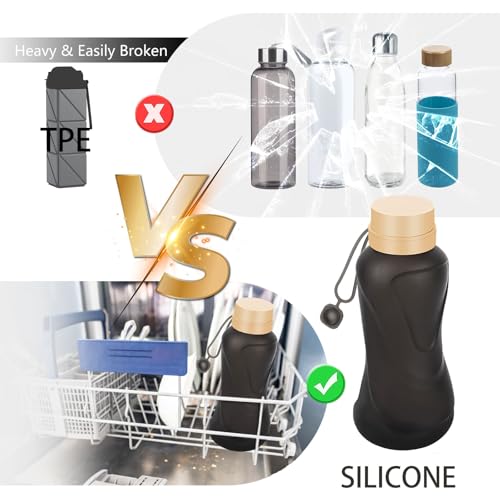 LEAK-PROOF AND EASY TO CLEAN: These reusable silicone water bottles feature a leak-proof construction with a tight-fitting cap to prevent spills and leaks. In addition, the wide neck design make it easy to clean and make sure a healthy drinking experience. Dishwasher secure.
