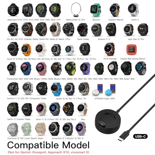 Super Compatibility: 1 long & 1 short cable compatible with Garmin Venu 3 Series, vivoactive 5, epix Series, fenix 7, Forerunner 265 Series, Forerunner 965, Bounce, Instinct Crossover Series, vivomove 3 Series, Instinct 2 Series, Enduro 2, Venu Series, Forerunner 55, Forerunner 955 Series, Forerunner 255 Series, Forerunner 45/45S, quatix 7 Series, Forerunner 745, Forerunner 945/ 945 LTE, Forerunner 245/ 245 Music, vivoactive 4/ 4S, tactix 7 Series, D2 Mach 1 Series, D2 Air X10, Approach G12/ S10/ S12/ S40/ S42/ S60/ S62/ S70, Swim 2, Venu Sq Series, BarkLimiter 2/ 2VT … Not for Garmin Vivosport, Approach X10, vivosmart 5