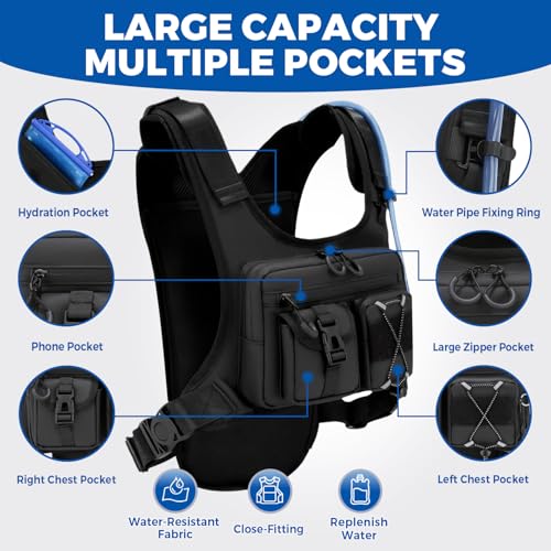 【Comfortable & Adjustable】 The adjustable straps on the chest bag guarantee that it fits you perfectly. The customizable fit ensures that the bag remains secure and minimizes unnecessary movement, especially during rigorous activity. The wide mesh shoulder pad helps to reduce the burden of your shoulder. This hydration vest backpack is made of lightweight material, ensuring that the added weight does not hinder your performance. The design emphasizes comfort and is suitable for prolonged wear.