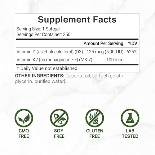 Dosage & Servings – Every easy-to-swallow mini softgel offers high concentrated vitamins for men and women. Providing 5,000iu of vitamin D3 with 100mcg of vitamin K2 with each and every serving and has 250 servings per bottle.