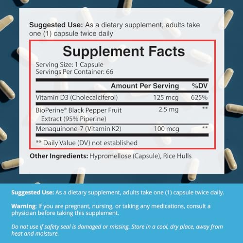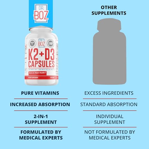 Dr. Boz – K2+D3 Capsules, 66 Servings – Vitamin D3 K2 Supplement with BioPerine – Bone & Heart Health – Enhanced Absorption – Quality Tested – Made in The USA – 5000iu (D3) – 400iu (K2) – Self Care