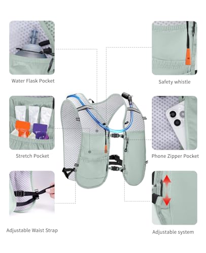 【Quite a lot of Storage】 Multi-pocket hydration backpack will give you Quite a lot of space to store your belongings. Your 500ml soft flasks, phone, key, money, food can also be easily stored in the front pocket, and the 2L hydration bladder, towels, clothes or other items can also be placed in the back pocket. Both the main zipper pocket and the front zipper pocket are made of waterproof fabric to make sure your clothes and phone stay dry.