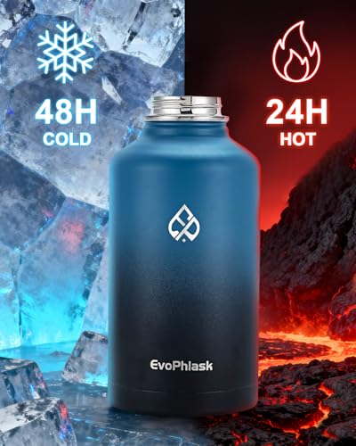 Hydration That Lasts All Day: Built with double-walled vacuum insulation, EvoPhlask 64oz insulated water bottle keep your drink icy cold for up to 48 hours or warm for 24 hours. This stainless steel water bottle is your perfect gym water bottle or sports companion for any adventure.