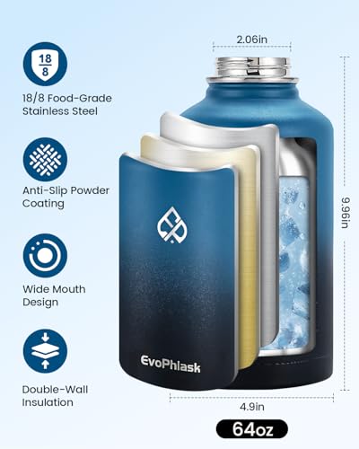 EvoPhlask Insulated Water Bottle 64 oz, Vacuum Stainless Steel Water Bottle Keep Cold 48Hrs, Half Gallon Large Water Jug for Travel, Sport, Gym, Hiking with Carrier Bag, Indigo/Black