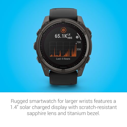 SOLAR-CHARGED DISPLAY AND DURABLE DESIGN: This advanced multisport GPS smartwatch boasts a 1.4” solar-powered, all the time-on display with a scratch-resistant sapphire lens, and a titanium bezel. Built tough for adventurers, it includes an LED flashlight for after-dark visibility and a 40-meter dive rating with leakproof metal buttons, perfect for diving and exploring extreme environments.