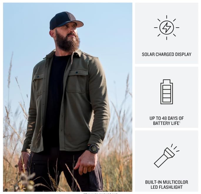 Advanced tactical GPS smartwatch includes a 1.4” solar charged display, titanium bezel and sapphire lens and built-in LED flashlight for after-dark visibility
