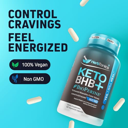 Herbtonics Keto BHB + BioPerine Keto Pills – Exogenous Ketones for Ketosis Support, Weight Management, GLP‑1 Support, Energy & Mental Focus, Vegan Friendly Non‑GMO Formula. 60 Vegan Capsules