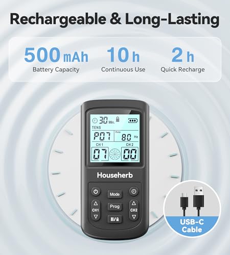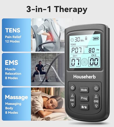 Househerb TENS Unit Muscle Stimulator for Pain Relief, 3-in-1 EMS TENS Machine with 28 Modes, 40 Intensity Levels, Dual Channel Rechargeable Massager with 8 Pads for Back, Neck, Shoulder, Sciatica