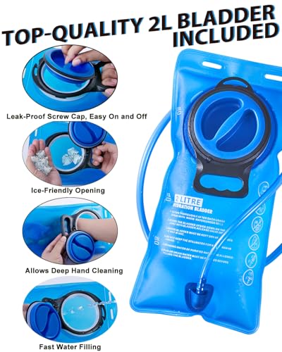 💖【Food-Grade hydration Bladder】Our water backpack for hiking is equipped with a 2-liter odor-free TPU bladder. The large opening with a screw cap allows you to fill it with water or ice in 5 seconds, and it is easy to clean—perfect for replenishing water anytime during hiking or cycling