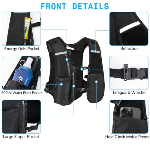✅ Ample Storage – 7+ pockets (front and rear) organize essentials like phones, keys, snacks, and a 500ml PET bottle. The main compartment can hold the hydration bladder and extra gear.