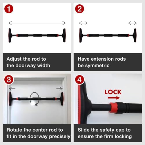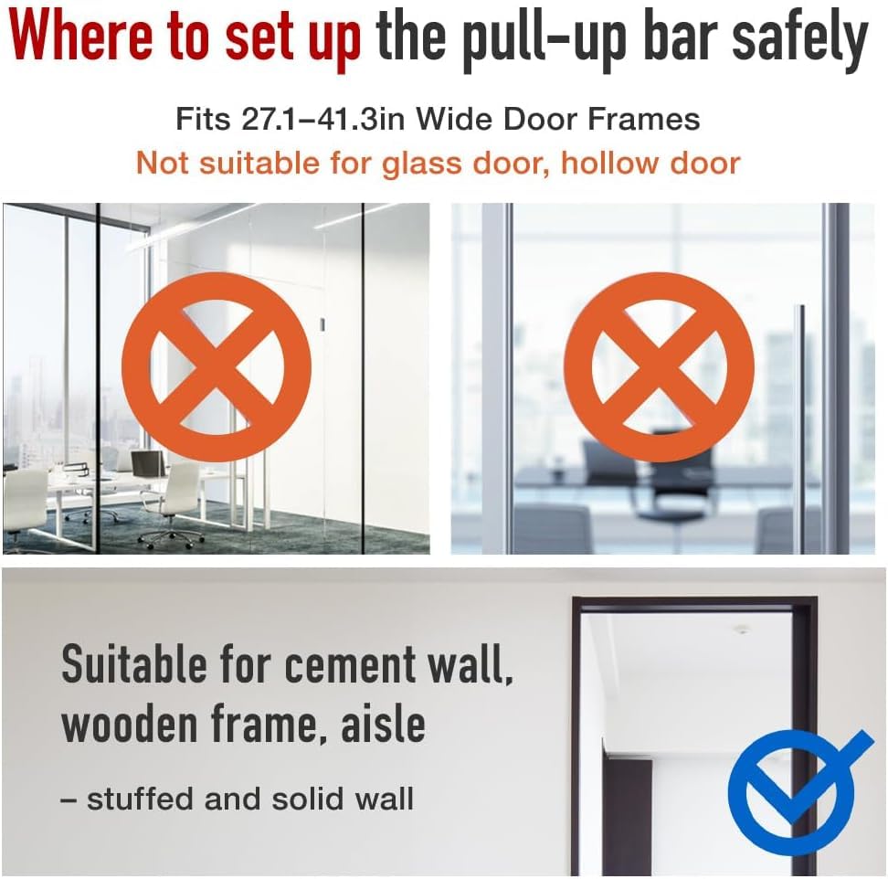 Suitable Doorway Width 27.1-41.3″: Pull up bar for doorway no screws is equipped with large anti-skid pad and please check and measure the width of the doorway, which you are planning to settle the chin up bar, the minimum is 27.1inches and the maximum is the 41.3inches to secure the safety of your workout at home