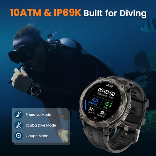 ➤【10ATM Waterproof for Diving】Boasting 10 ATM and IP69K ratings, the waterproof smart watch is built for demanding underwater activities, including freediving to depths of 148 feet. Its robust construction ensures it remains securely sealed and reliable under pressure.