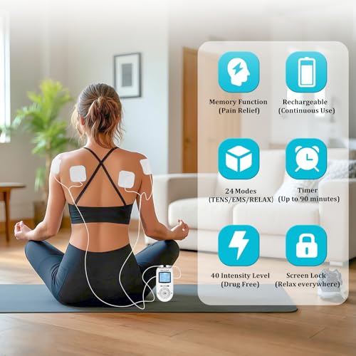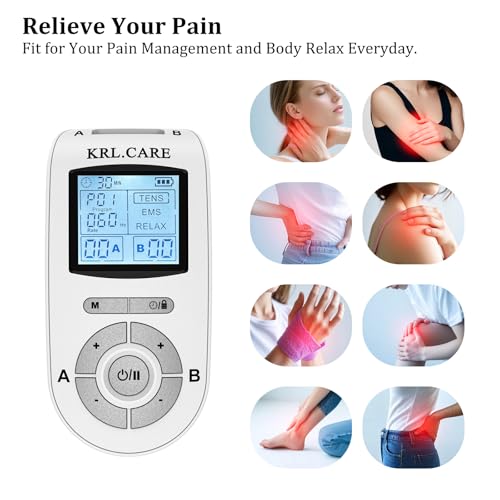 KRL.CARE Dual Channel TENS EMS Unit 40 Intensities for Gradual Pain Relief Therapy, 24 Modes Muscle Stimulator, Electronic Pulse Massager with 8 Pads, Dust-Proof Drawstring Storage Bag