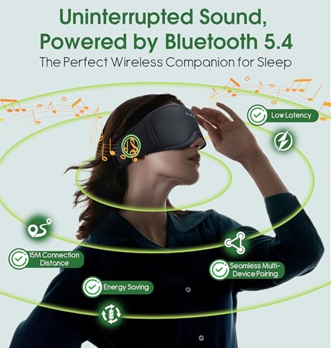Immersive High-Fidelity Bluetooth 5.4 Audio: Experience a private concert for rest with the advanced Bluetooth sleep headphones in our sleep mask. Featuring cutting-edge Bluetooth 5.4, it ensures a rock-solid, low-latency connection. Enjoy seamless, lossless music, podcasts, or white noise by means of 900Kbps transmission—all without bulky earpieces. This Bluetooth eye sleep mask creates an immersive sound blanket, perfect for masking distractions and guiding you into deep, restorative sleep