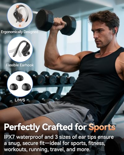 Ergonomic Silicone Earhooks for Secure, All-Day Comfort: Soft ergonomic silicone ear hooks balance comfort and stability, keeping each 7.3 g earbud secure during high-intensity interval training, cycling and long runs. Three pairs of silicone ear tips (S/M/L) let you fine-tune isolation; the medium size comes pre-installed so most users can wear these wireless earbuds straight out of the box—ideal sports earphones for all-day use.