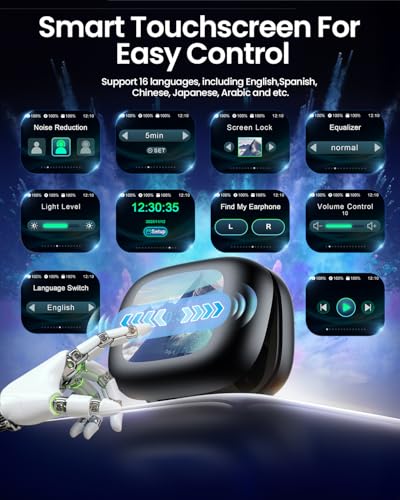 REVOLUTIONARY TOUCHSCREEN CHARGING CASE — Experience next-level convenience with the TP03 wireless earbuds. The smart charging case features a responsive touchscreen that permits you to play music, adjust volume, switch between ANC/Transparency modes, toggle 5 EQ presets (Normal/Rock/Classic/Pop/Jazz), and even trigger your phone’s camera remotely for perfect hands-free shots. Customize the screen with 5 preset wallpapers, or use the Find My Earbud feature on the intuitive 16-language interface to make out of place earbuds beep. Everything you wish to have is right at your fingertips.