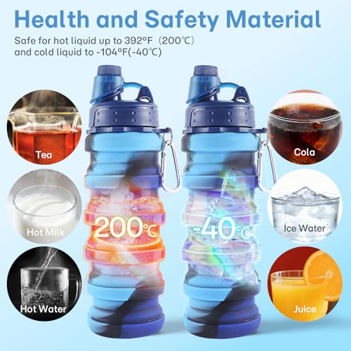 [Food-Grade Safety Standard] The collapsible water bottle is made of food-grade silicone (bottle body) and pp (bottle cap) materials. Our materials have passed the US Food Safety Certification (FDA) free of BPA and other harmful substances. Safety for a wide range of temperatures: -104°F to 392°F. With a view to avoid burning, we recommend you don’t use the bottle for liquid temperatures higher than 140°F.