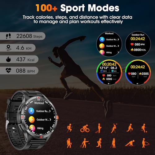 【100+ Sport Modes & 24/7 Health Monitoring】Track each move with 100+ sport profiles—running, cycling, gym, rock-mountaineering, you name it. Real-time stats cover heart rate, distance, speed, and calories. IP68 water resistance means rain, sweat, or hand-washing never slow you down.Military Smart Watches for Men built-in sensors frequently track heart rate, blood-oxygen, and sleep. All viewable on the watch or in the companion app.