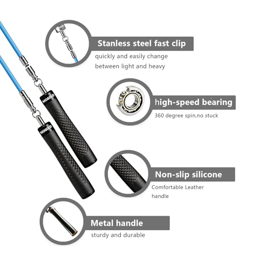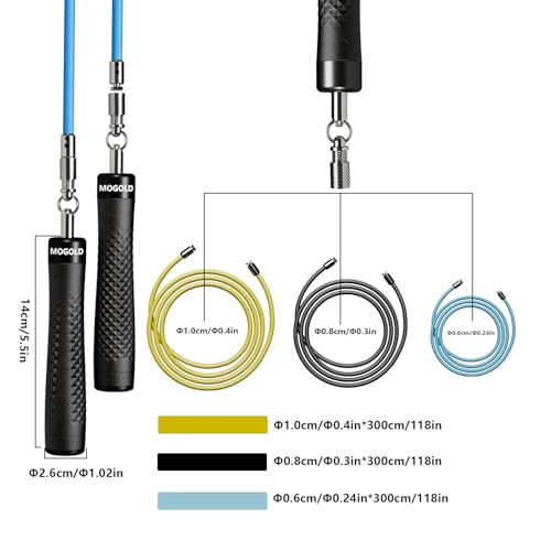 Elevate your fitness routine with this premium weighted jump rope set featuring three interchangeable speed cables. The set includes two professional-grade handles with a distinctive diamond-textured grip pattern and gold accents, measuring 1.02 inches in diameter and 5.5 inches in length. Every cable spans 118 inches with varying thicknesses – 0.24, 0.3, and 0.4 inches (color-coded in blue, black, and yellow) – allowing you to progress from beginner to advanced skill levels. The handles feature high-speed bearings for smooth 360-degree rotation and a quick-release mechanism for simple cable changes. The textured non-slip silicone grip ensures safe keep an eye on right through intense workouts, whilst the durable metal construction provides lasting performance. The set comes complete with a sturdy carrying case featuring the MOGOLD logo, perfect for organization and transport. Whether you’re into CrossFit, speed training, or general fitness, this versatile jump rope set adapts for your training needs with its a couple of cable options and ergonomic design.