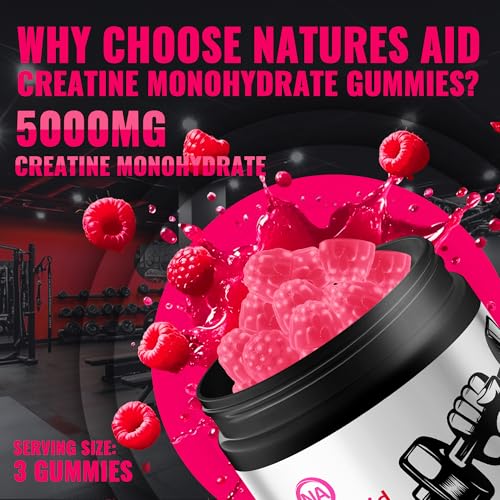 Natures Aid NSF Certified Creatine Gummy 5g – Creatine Monohydrate Gummies – Pre-Workout Energy & Muscle Growth Support for Men & Women | Raspberry Electrolyte Gummies (135 Count)
