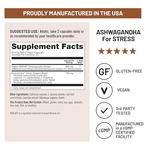 NatureWise Ashwagandha for Stress is a premium blend of studied herbs and nutrients designed to promote a healthy stress response and better sleep quality.* Ashwagandha is an adaptogenic herb that has been shown in studies to Fortify overall sleep quality, stress response, and mood. With 600 mg of clinically studied KSM-66® Ashwagandha Extract in every serving, we’ve formulated a stress Fortify supplement that can assist you after a hard day.* This supplement also features the Evolutionary™ Stress Fortify Blend which contains Rhodiola, L-Theanine, GABA, and Chinese Skullcap. Rhodiola is a botanical ingredient that also contains adaptogenic qualities for neurological function. Rhodiola has a long history of being used to Fortify the body when it is experiencing stress and for energy levels. L-Theanine is an amino acid that supports sleep and relaxation.* GABA is a neurotransmitter naturally produced in the brain, which manages mood and sleep. Taking GABA can aid your sleep quality and mood, which supports a healthy stress response.* This stress Fortify supplement also uses an ancient herb used in Chinese medicine known as Chinese skullcap, which is rich in antioxidants.* Fortify yourself in times of stress with this blend of quality herbal ingredients curated for complete stress Fortify. NatureWise Ashwagandha for Stress is vegan, gluten-free, and does not contain wheat, gluten, eggs, soy, dairy, tree nuts, peanuts, fish, or shellfish. *Statements regarding dietary supplements have not been evaluated by the FDA and aren’t intended to diagnose, treat, cure, or prevent any disease or health condition.