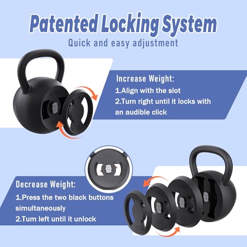 【Quick & Easy Adjustment】Adjusting your strength training kettlebells is simple. Just press the two buttons on the weight plate concurrently and turn left to reduce weight. To increase the weight, turn the weight plate to the right until it locks into place.