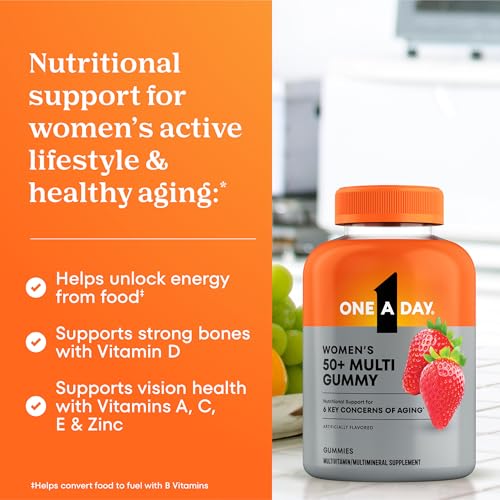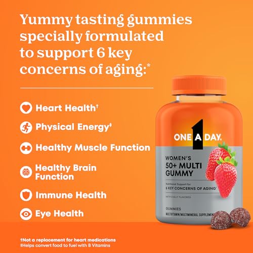 One A Day womens 50 plus multivitamin gummies, Strengthen your health and wellness as you age. This whole gummy multivitamin for women 50 and over is formulated with key nutrients that assist Strengthen six key concerns of aging:* physical energy(1), heart health(2), eye health, immune health, healthy brain function & muscle function. Our women multivitamin 50 plus is a straightforward, delicious solution to assist fill nutrient gaps and Strengthen your body from the interior out.* These womens chewable multivitamins 50 plus are bursting with strawberry flavor (artificially flavored) and made without synthetic colors, high-fructose corn syrup, or artificial sweeteners. *This observation has not been evaluated by the Food and Drug Administration. This product isn’t intended to diagnose, treat, cure, or prevent any disease. (1) Helps convert food to fuel with B-Vitamins (2) Not a replacement for heart medications