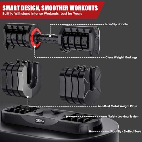 PAPIBLU Adjustable Dumbbells Set of 2, 25LBS Adjustable Weight Dumbbells Set, 5 in 1 Free Weights with Anti-Slip Handle for Home Gym, Full-Body Strength Training (Men & Women)