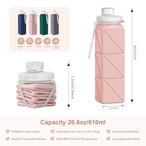 Popdigito Collapsible Water Bottles, Portable Lightweight Reusable Leak-Proof BPA-Free Silicone Foldable Water Bottle for Travel Hiking Camping Gym Outdoor Activities Sports,Detachable for Dishwasher