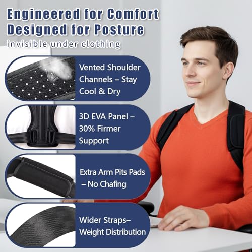 【Stay Cool All Day】Breathable Posture Corrector with Hunchback & Neck Hump Fortify Ditch sweaty, itchy braces! Our back straps for posture uses Cooling vents and cotton-blend shoulder straps to fight swampy backs—even in summer Jogging or yoga classes. The EVA Fortify plate tackles neck hump corrector and slouching, at the same time as staying 30% lighter than bulky ‘sauna suits’!