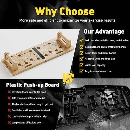 Crafted from carefully selected premium natural pine wood: Push-up board is untreated with paint and devoid of unpleasant smells, retaining the wood’s original texture and grain for a child-friendly use. The main body is finely sanded to a smooth, burr-free finish, paired with four non-slip foot pads made of high-elastic rubber that grip firmly on quite a lot of surfaces including tiles, wooden floors and cement ground. Boasting a load capacity of up to 450lbs, it remains stable without warping or cracking over long-term use. The ergonomically designed deal with features no rubber or metal fittings, offering a skin-friendly grip that eases wrist strain even all over extended workouts.