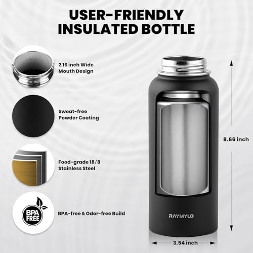 Triple Wall Insulation: Raymylo 32 oz Modern Insulated Water Bottle featuring copper plated triple wall vacuum insulation, is tested to keep your drinks icy cold for up to 48 hrs and reassuring warm 24 hrs. Get this iconic water bottle to up your fitness track, You can fall for hydrating as each sip is absolutely cool