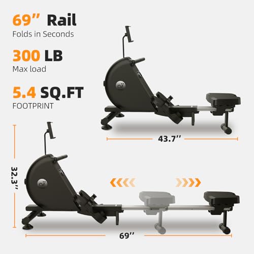 Premium Build for All Body Types Built around a 69-inch aluminum alloy rail for superior stability, the Snailcle M1 magnetic rowing machine is engineered to support users from 4’9” to 6’6” and up to 300 lb capacity. Whether you’re a beginner or seasoned rower, the rugged frame and quick-assembly design let you set up your home gym in minutes. Designed with high-quality materials, it delivers long-lasting performance for full-body workouts day after day