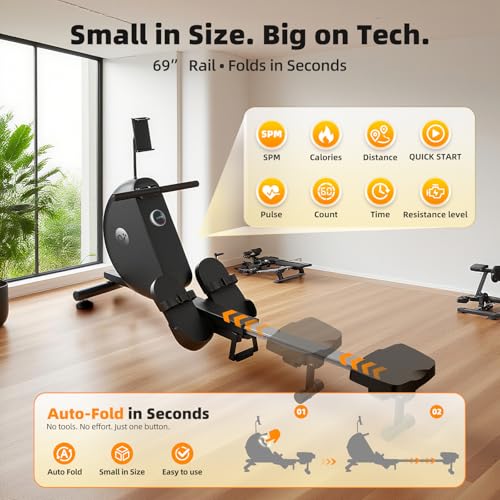 Power Touch Auto Extend & Retract Enjoy a truly foldable rowing machine experience with our Power Touch Auto Extend & Retract feature. Press once, and the rail extends smoothly for training; press again, and it folds back—requiring only 5.4 sq ft footprint. Built-in transport wheels make it a compact rower that moves as easily as it stores. Perfect for small spaces like apartments, condos, or tight home gym corners