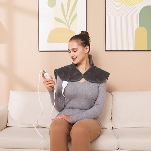 Ruqiji 19”x24” weighted neck&shoulder heating pad offers doublewide therapeutic coverage for sore muscles of your back, legs, and shoulders. With nearly twice the surface area of standard heating pads, it is ideal for wrapping around large areas to relieve arthritic pain, muscle ache and stiff joints. Use for just 20 minutes daily (or as recommended by your doctor) to increase blood go with the flow and reduce pain and muscle spasms. Distributed glass beads in this heating pad can produce 2.5lb pressure, which makes the heating pad fit your any body parts better and focus and save more heat. And it helps relieve pain more effectively than a traditional heating pad because the weighted pressure design can better embrace you and relieve anxiety.