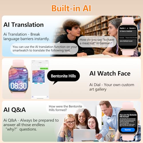 Built-in AI(Translation/Q&A/Watch Face): The AI function is a highlight of this smartwatch. The AI watch face allows you to create his or her favorite watch face at will; The AI Q&A function allows you to ask questions at any time and easily obtain information, learn more knowledge, and even get health advice; The AI real-time translation function can solve your language barriers, making it easy for you to make foreign friends and travel abroad without obstacles.