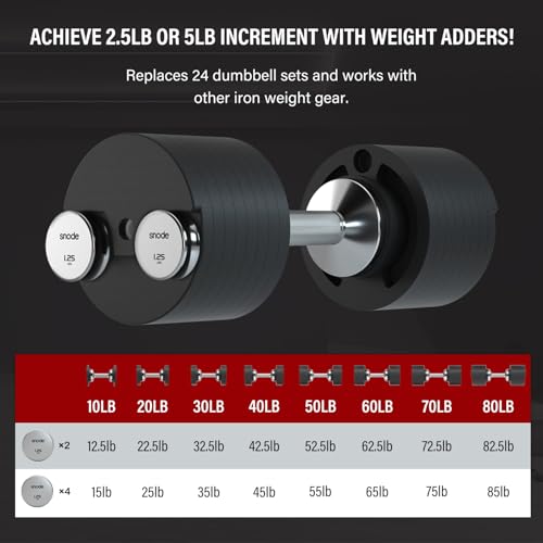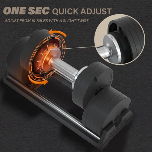 【Adjust weights in seconds】Turn the dial to adjust the weight. 8 weights set in one dumbbell, weight selection: 10, 20, 30, 40, 50, 60, 70, 80 lbs. SNODE Adjustable Dumbbells is to adjust the weight on both sides of the dumbbell at the same time.